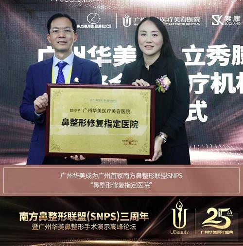 广州华美医疗美容医院作为此次学术论坛的承办方,以曾高主任为领头人呈现的超高的鼻整形技术水平以及艺术水准,赢得了现场与会医师的一致肯定。主办方南方鼻整形联盟(SNPS)亦对此次峰会论坛做出了高度的评价,为推动华南区鼻整形事业阔步向前发展,决定授予广州华美为“鼻整形修复指定医院”。