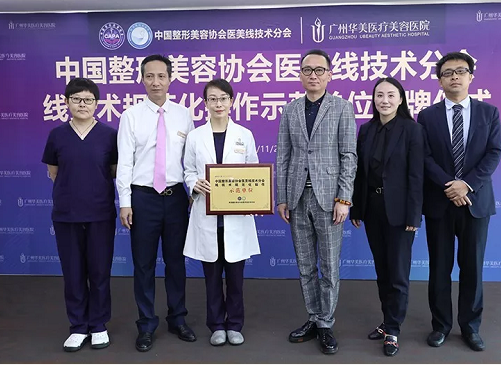 ▲中国整形美容协会医美线技术分会会长石冰主任、中国整形美容协会医美线技术分会常务理事王晓阳 院长与广州华美总经理金晶女士、赵晶晶副院长、副总经理张晨钟先生、微创注射杨澄宇主任共同参加了线技术规范化操作示范单位的授牌仪式!