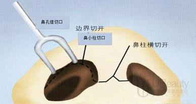 切口在鼻小柱下端的狭窄处,平视的情况下别人是看不到的;另外,我们做的不是直线切口,而是飞鸟形的切口,缝合线也非常细,美容缝合是不会留疤的。切口位置如下